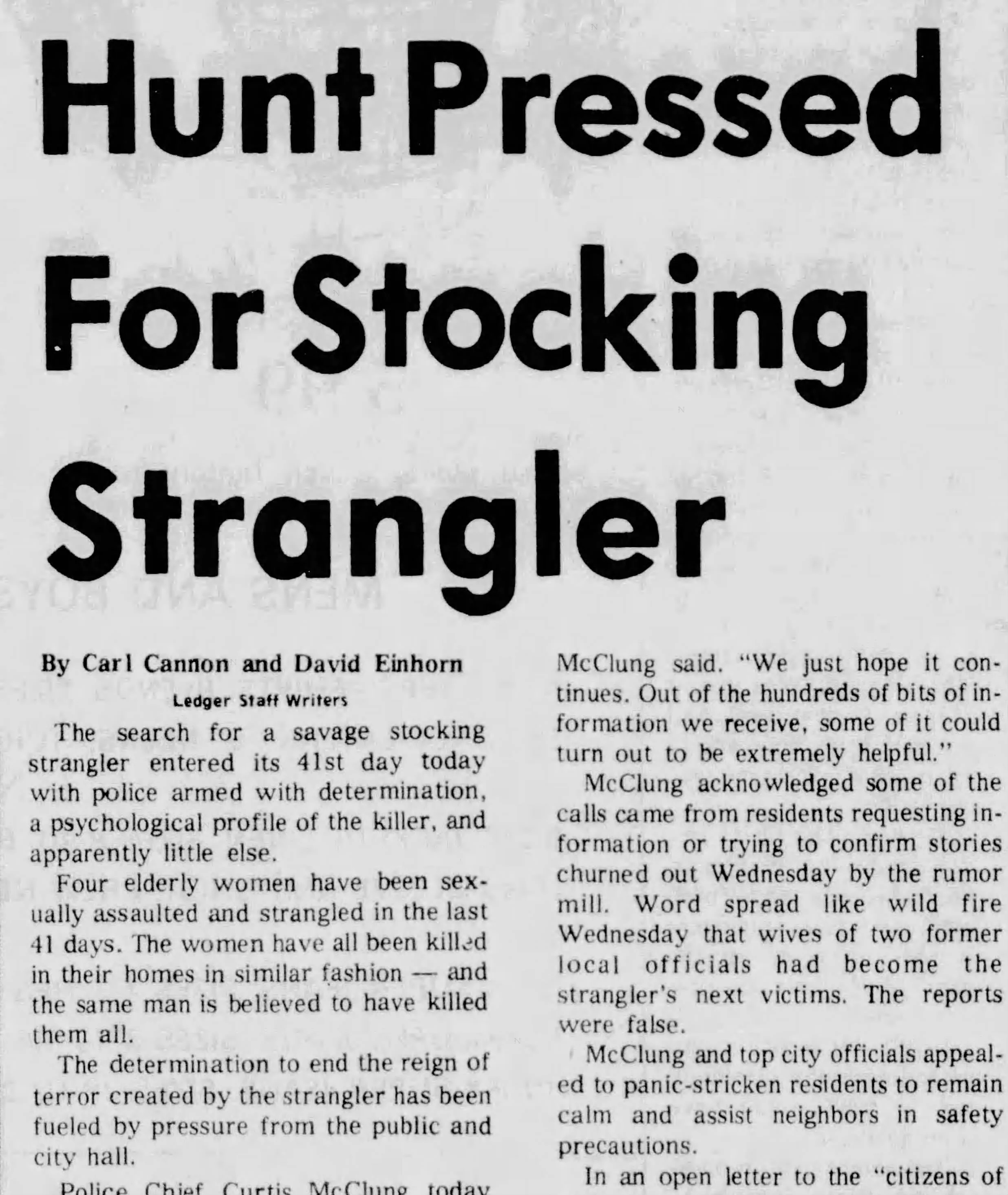 Most of the victims were strangled with nylon stockings wrapped two or three times around their necks. Hair found at one scene led police to suspect the killer was Black. All of the victims were white.